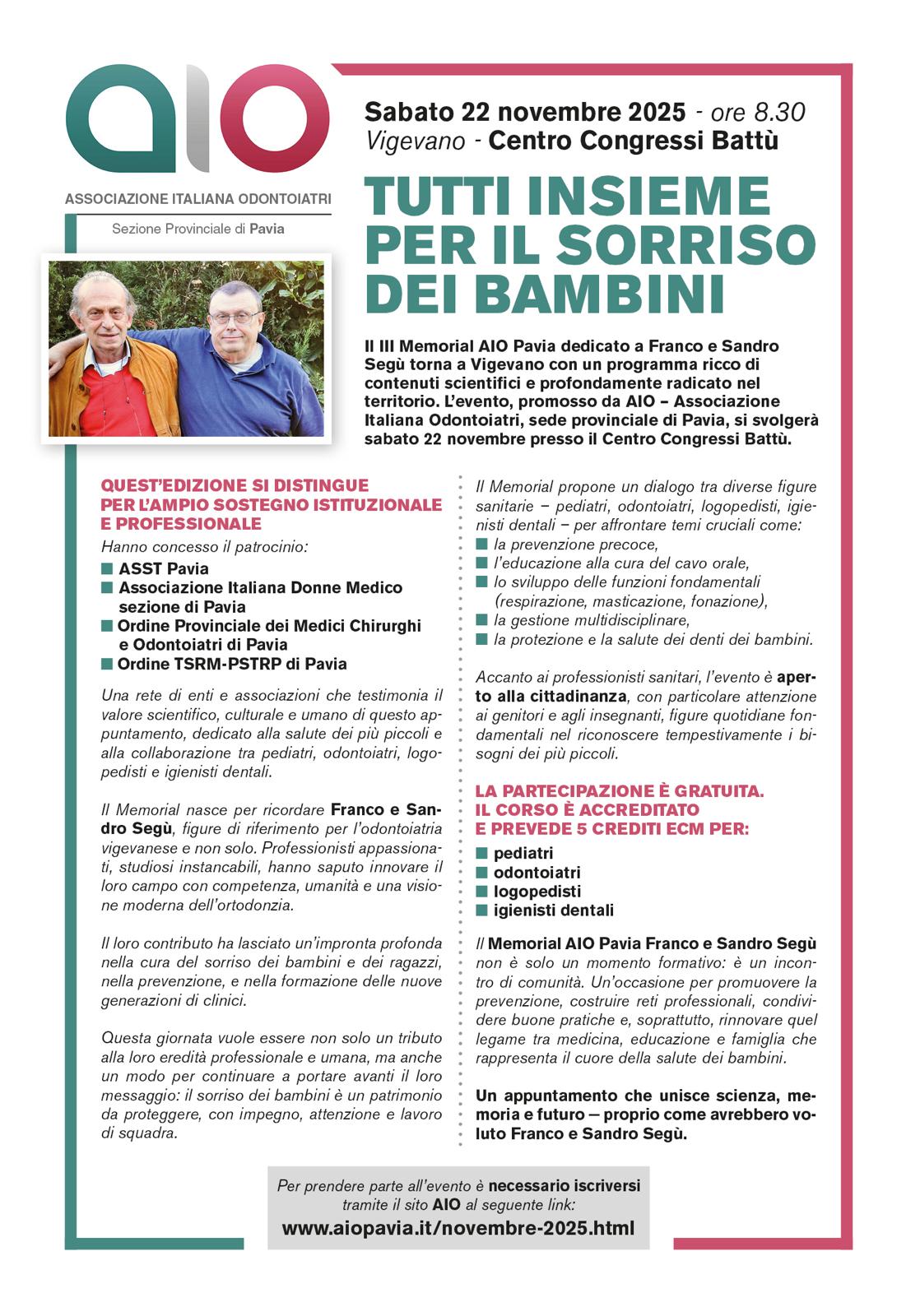 Il Memorial AIO Pavia Franco e Sandro Segù non è solo un momento formativo: è un incontro di comunità, un’occasione per promuovere la prevenzione, costruire reti professionali, condividere buone pratiche e, soprattutto, rinnovare quel legame tra medicina, educazione e famiglia che rappresenta il cuore della salute dei bambini. Un appuntamento che unisce scienza, memoria e futuro — proprio come avrebbero voluto Franco e Sandro Segù.